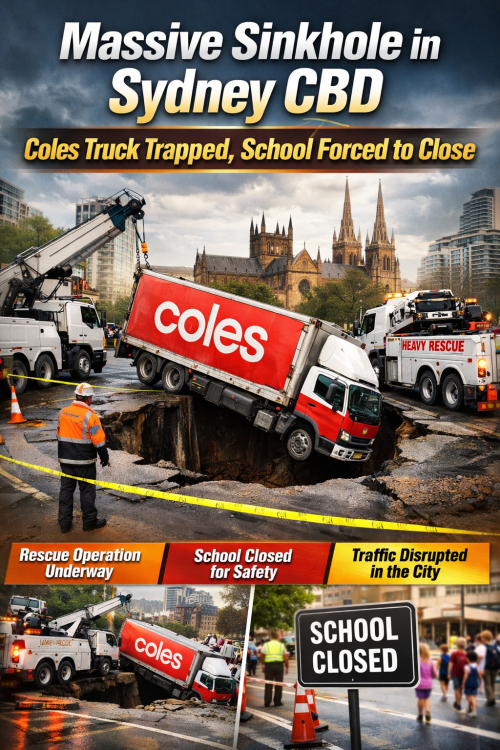 सिडनी सीबीडी में सड़क धंसने से बड़ा हादसा, कोल्स ट्रक सिंकहोल में फंसा — स्कूल बंद