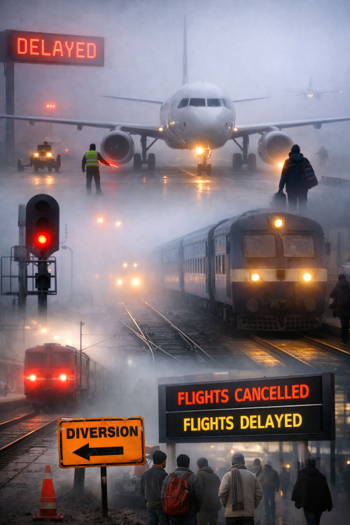 घने कोहरे का कहर: हवाई और रेल यातायात प्रभावित, 50 से अधिक ट्रेनें लेट, कई उड़ानों पर असर