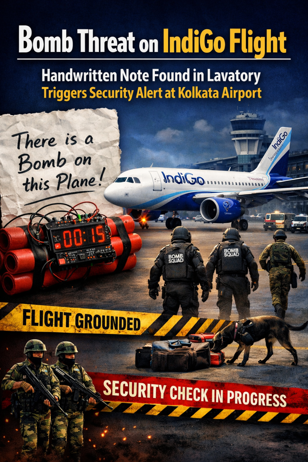 कोलकाता एयरपोर्ट पर इंडिगो फ्लाइट में बम की धमकी, टॉयलेट में मिला हस्तलिखित नोट; विमान आइसोलेशन बे में खड़ा कर जांच जारी